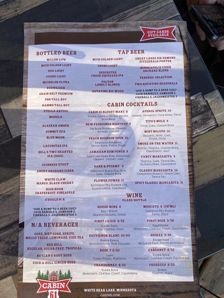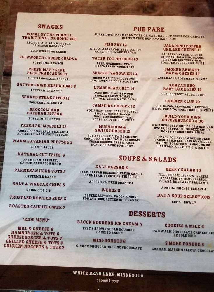 Introducing Cabin 61, a sports bar and American restaurant located in White Bear Lake, MN. This cozy spot offers a variety of options, from stuffed nachos to specialty wings like Dragon's Fire and Cajun Blues. Customers rave about the unique twist on classic bar food, such as the peanut butter and jelly burger. The outside patio and friendly service add to the welcoming atmosphere. Whether you're craving fish and chips, pulled pork tacos, or a mouthwatering burger, Cabin 61 has something for everyone. Don't miss out on their signature dishes and drinks, like the pork belly BLT and wild Alaskan cod. With options for vegan and gluten-free diners, Cabin 61 is a must-visit destination for a casual meal with friends and family.